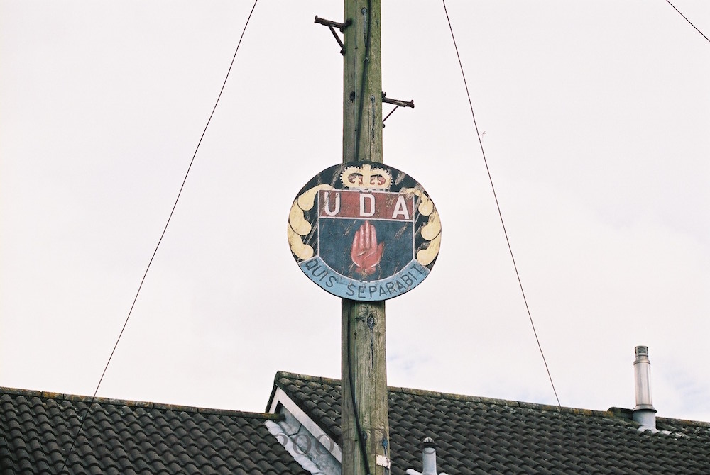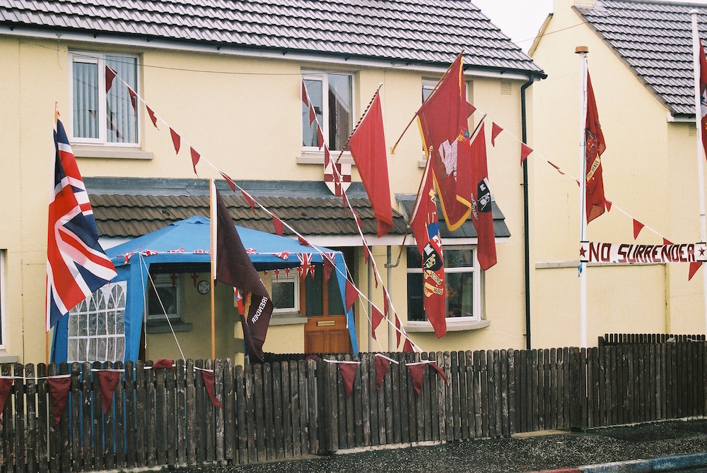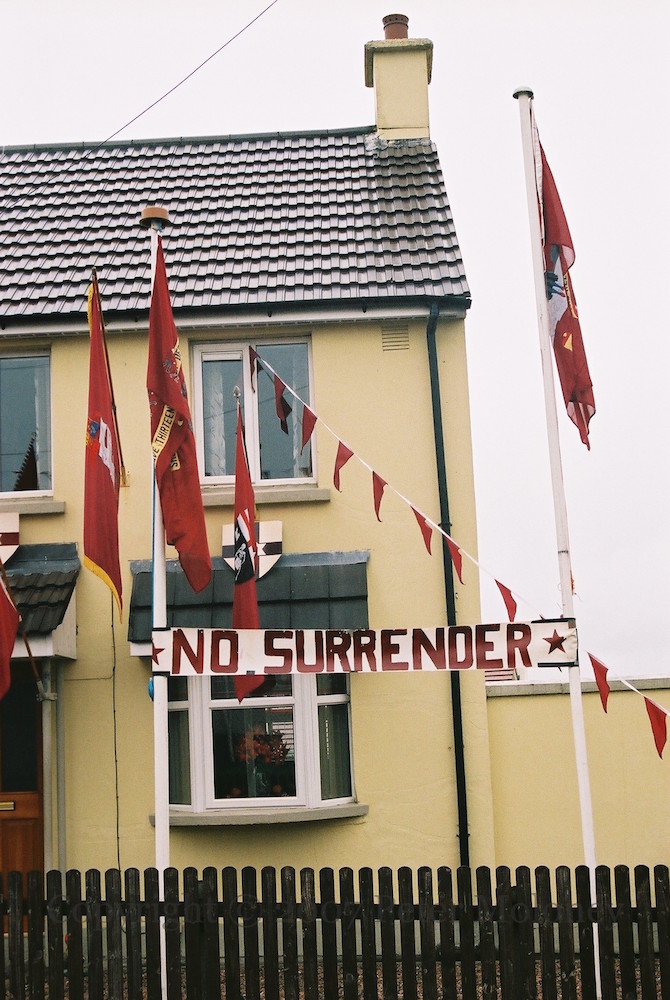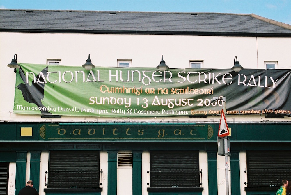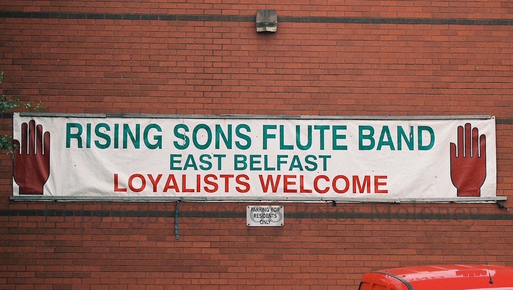 A banner announcing the Rising Sons Flute Band outside their practice hall in Castlereagh Street, east Belfast. (Also from 2008: Rising Sons Flute Band mural.)