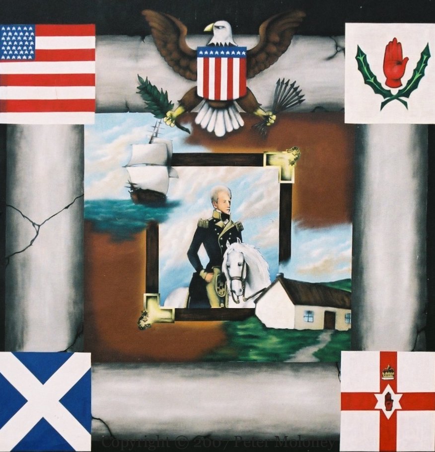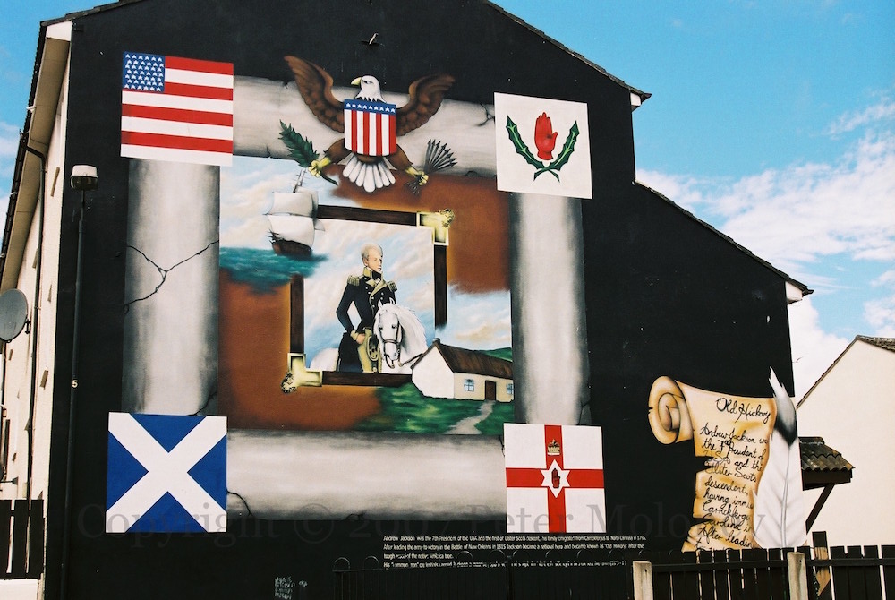 The information along the bottom reads: “Andrew Jackson was the 7th President of the USA and the first of Ulster-Scots descent, his family emigrated from Carrickfergus to North Carolina in 1765. After leading the army to victory in the Battle Of New Orleans in 1815 Jackson became a national hero and became known as “Old Hickory” after the tough wood of the native American tree. His “common man” credentials earned Jackson a massive popular vote and swept him into the Presidency for two consecutive terms (1829-1837).” He also hated the British, owned slaves, and signed the Indian Removal Act of 1830, which led to the infamous “Trail of Tears” (Irish Times).