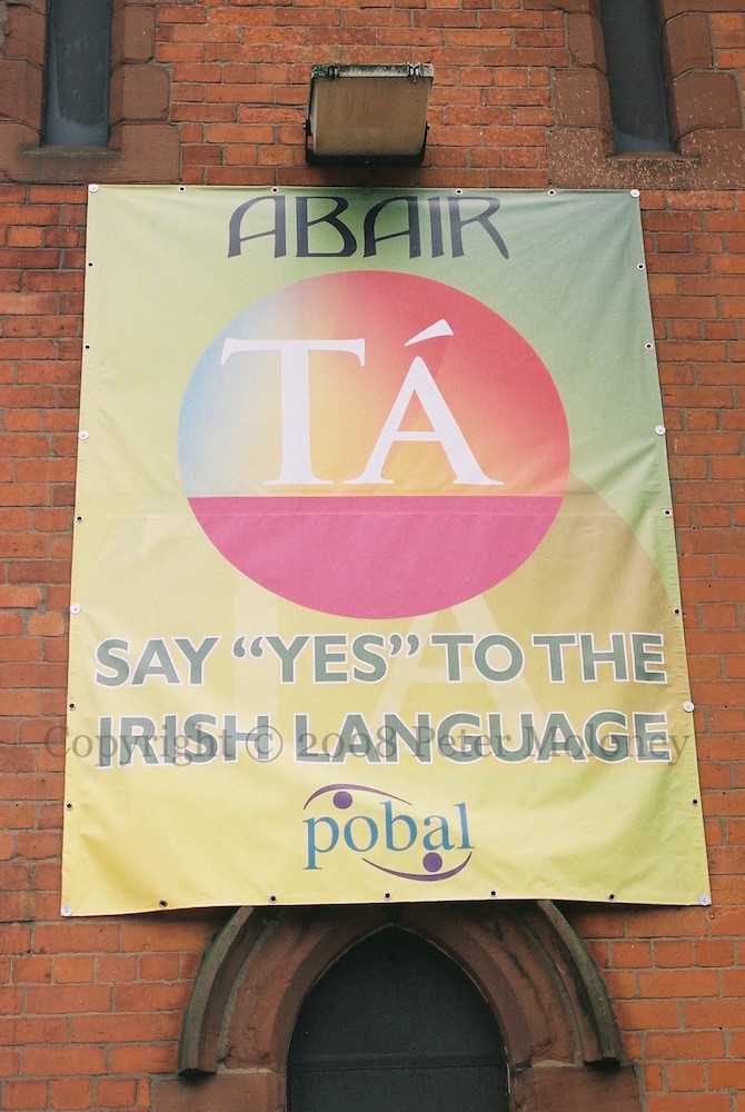 “Say “Yes” to the Irish language” on the outside wall of An Chultúrlann. Pobal is a non-profit community-development organisation.