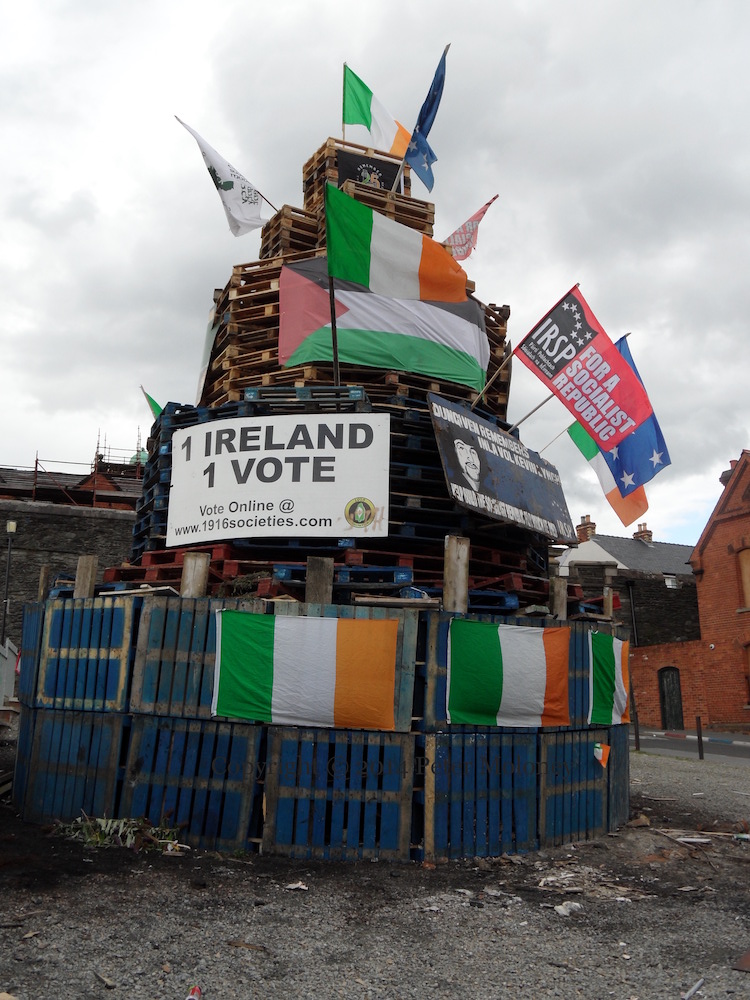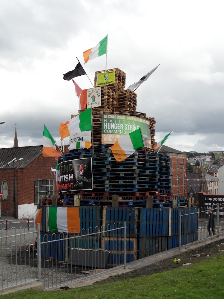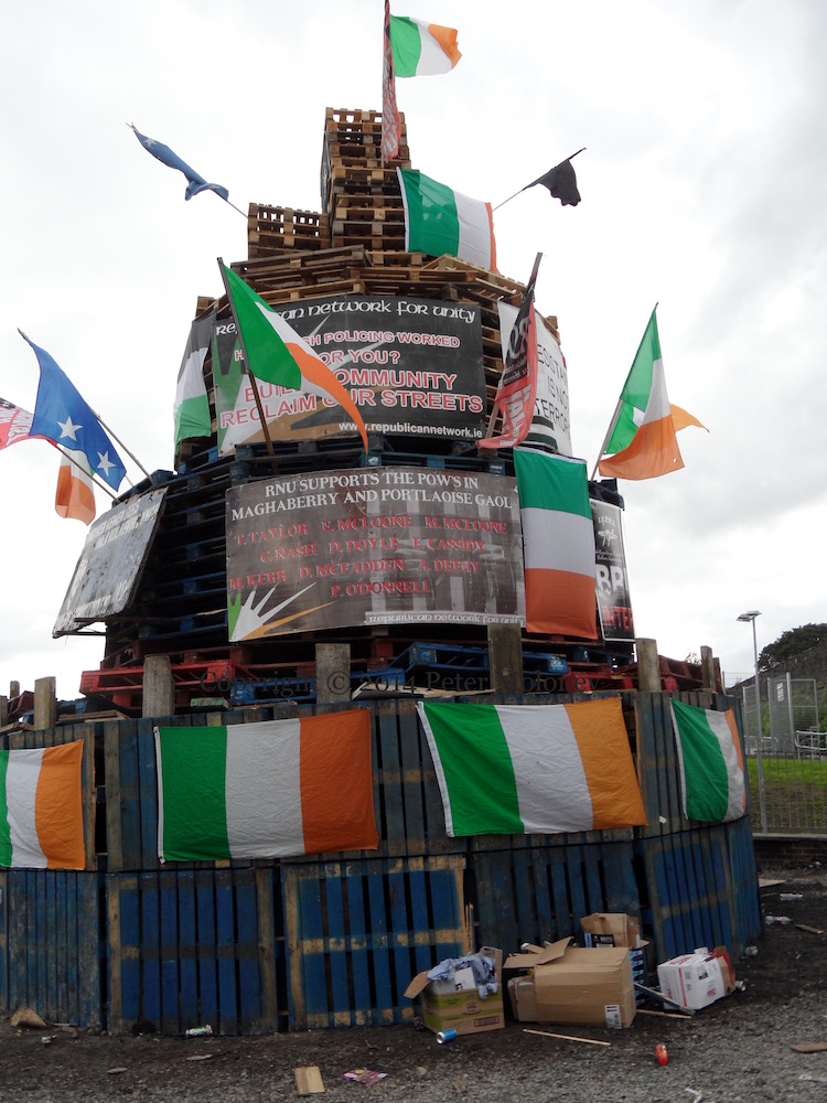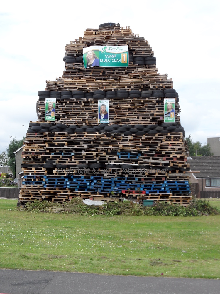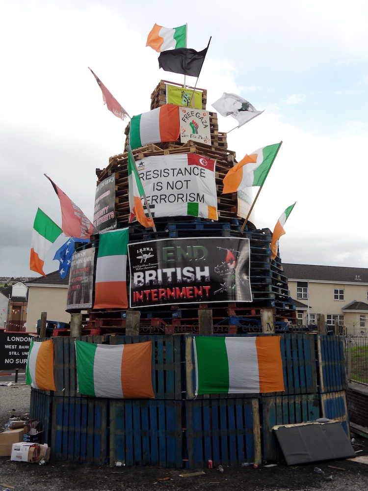 This is the internment (or “assumption”) bonfire (and mini-bonfire) in the Bogside decked with a range of flags — UVF/YCV, UDA, Orange Order, the Paras, Israel, Ulster Banner, Union Flag – and an “RUC” land-rover.