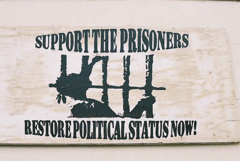 Facing each other in the Brompton Park entrance to Ard Eoın: “Support the prisoners – restore political status now!” from post-peace republicanism, and Cumann na n-Iarchımí Poblachtacha/Republican Ex-Prisoners Association (along with SNAP – Safer Neighbourhood Ardoyne Project – and Glór An Tuaıscırt/Voice Of The North) representing the pre-peace volunteers.