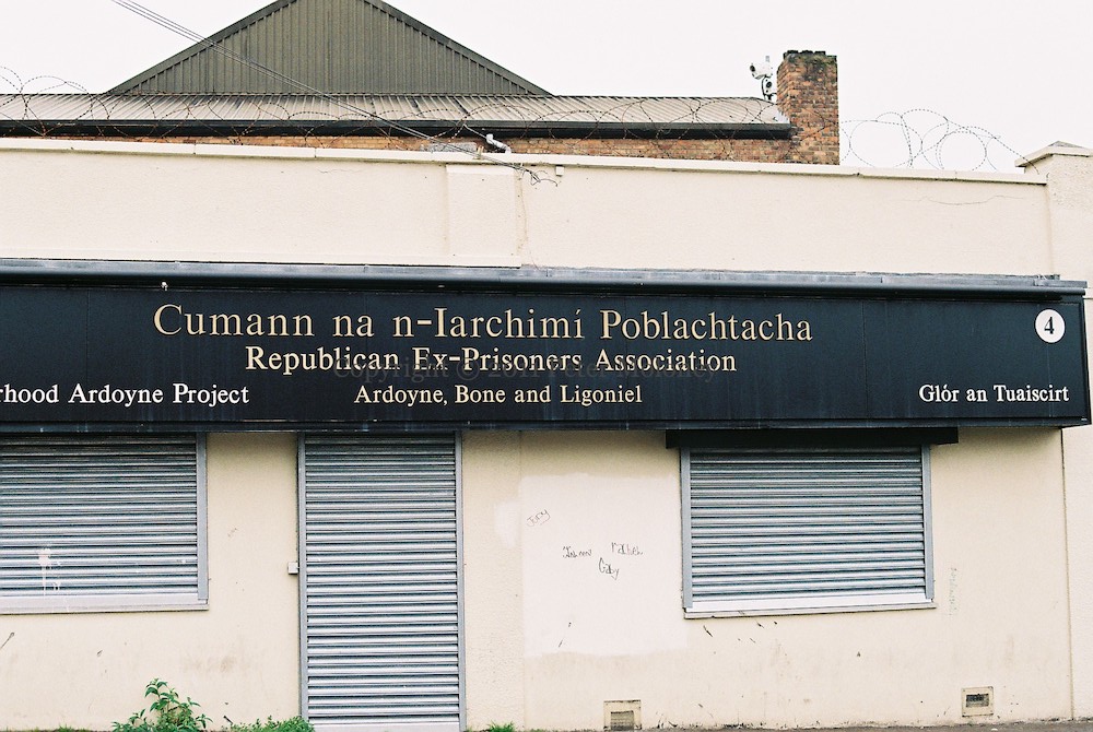 Facing each other in the Brompton Park entrance to Ard Eoın: “Support the prisoners – restore political status now!” from post-peace republicanism, and Cumann na n-Iarchımí Poblachtacha/Republican Ex-Prisoners Association (along with SNAP – Safer Neighbourhood Ardoyne Project – and Glór An Tuaıscırt/Voice Of The North) representing the pre-peace volunteers.