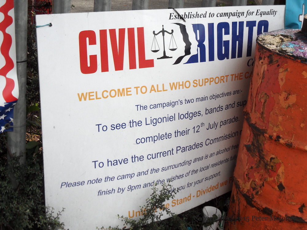 A camp was established on the site on Twaddell Avenue with signs using the language of “civil rights” and “equality”: “Established to campaign for Equality. Civil Rights. Welcome to all who support the campaign. The two main objectives are to see the Ligoniel lodges, bands and supporters complete their 12th july parade; to have the current parades commission removed. Please note the camp and the surrounding area is an alcohol free zone. All music must finish by 9 p.m. and the wishes of the local residents fully respected. Thank you for your support. United we stand – divided we fall.”