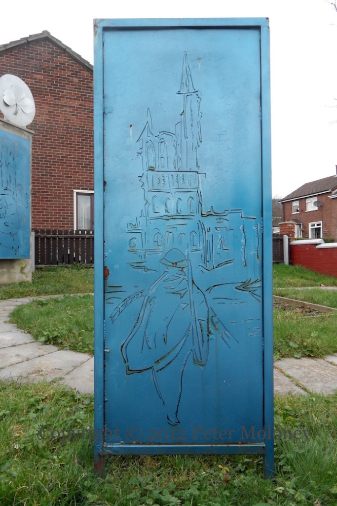 These are two painted metal-worked pieces bolted to the “peace” line on Cupar Way, celebrating “Shankill Ingenuity” and “Identity, Heritage”, while commemorating the lives lost on Titanic.