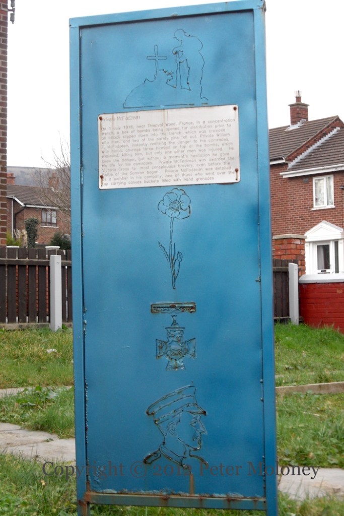 Here are images from the four panels that comprise the WWI memorial in Mount Vernon, showing men attacking (Thiepval?) wood, the battlefields around Messines, a soldier approaching a church with a spire, and back-to-back memorials to John Condon, the Waterford [city] “boy soldier”, who died aged 14 in a gas attack – “his memory is kept alive as a symbol of the futility of war” – and William McFadzean, who won a VC for throwing himself on a dislodged box of hand grenades.