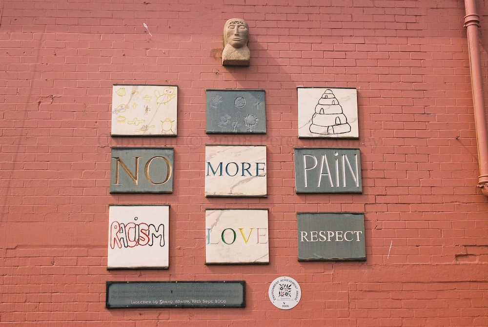 “C Company Street” [UVF] with a mosaic of the emblem of the 36th (Ulster) Division “this artwork was created by young people from Shankill Alternatives”. See also: RPG Avenue.