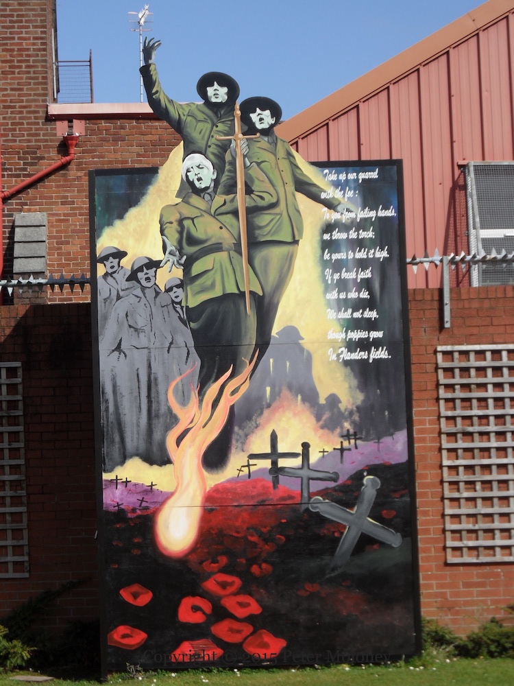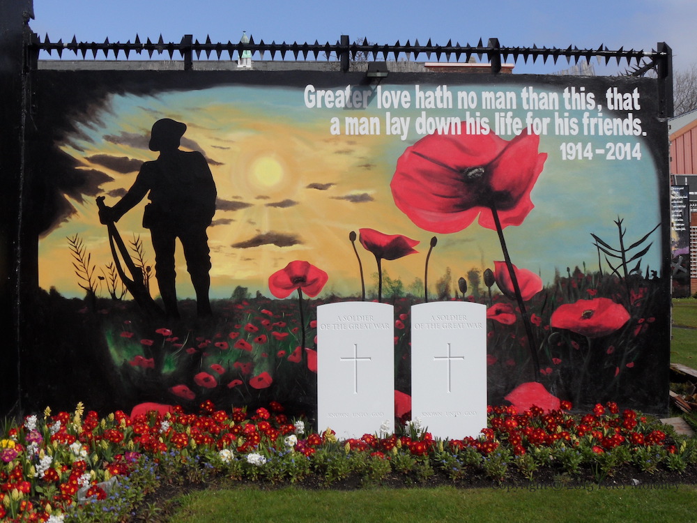 The Somme memorial Garden Of Reflection (between the Shankill graveyard and the Mountainview Tavern) has two new pieces. The first places two headstones (both reading “A soldier of the great war”) in a flower-bed in front of the mural, which shows a soldier, presumably from the Ulster division, on the fields of Flanders: “Greater love hath no man than this, that a man lay down his life for his friends. 1914-2014”