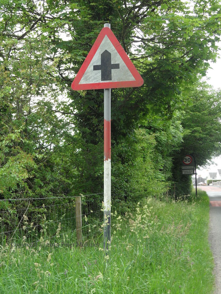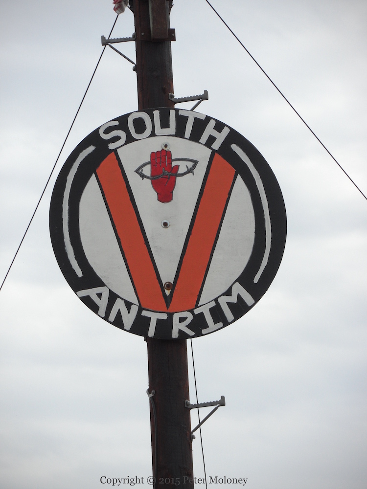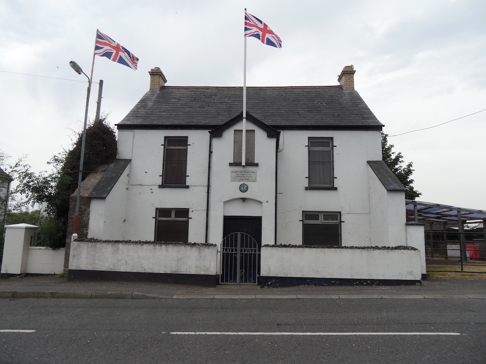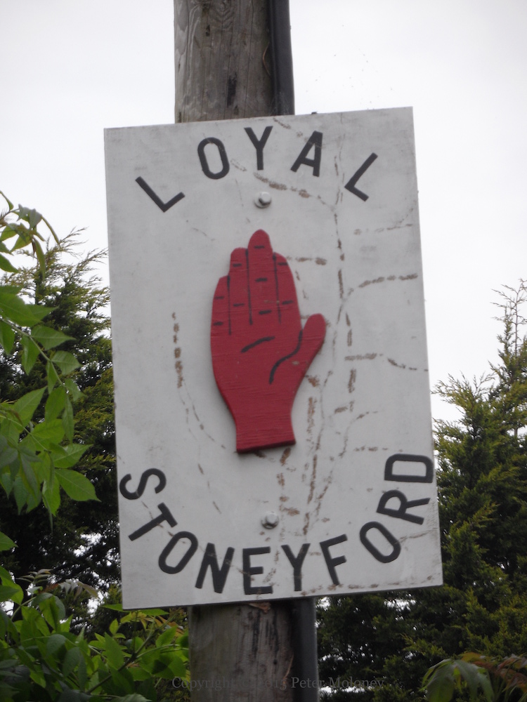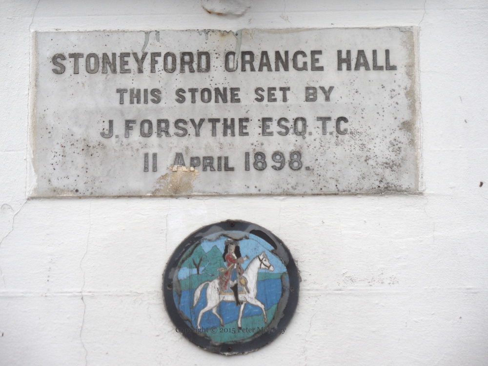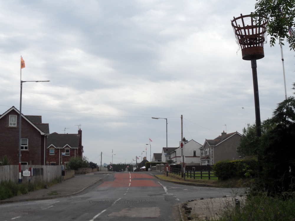 Here is a gallery of images from the village of Stoneyford, ten miles north of Lisburn. The view in the final image is from the cross-roads at north end of the village, with the brazier next to the WWI memorial visible on the right, and the nameplate on the fence on the left. The Orange Hall is in the middle of the village. The village was a centre for the small anti-Agreement organisation the “Orange Volunteers” (WP).
