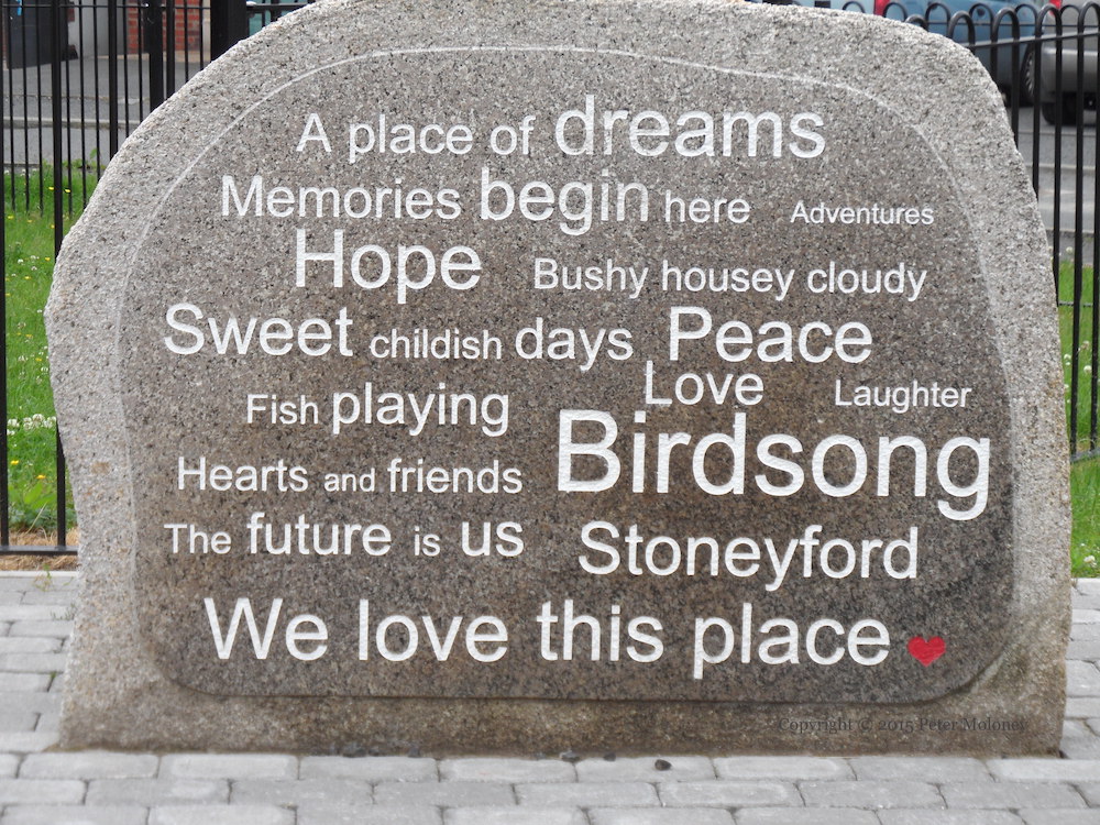 This pair of boards in Irvine Crescent, Enniskillen, is notable for their construction out of pieces of board that have been cut/carved before being layered onto a background board.