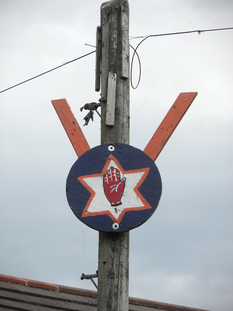 “Internment! Speak out! Maghaberry, Portlaoise, Hydebank. Irish Republican Prisoners Welfare Association [web]”. This painted board is on the roundabout at the top of Eastway, Derry