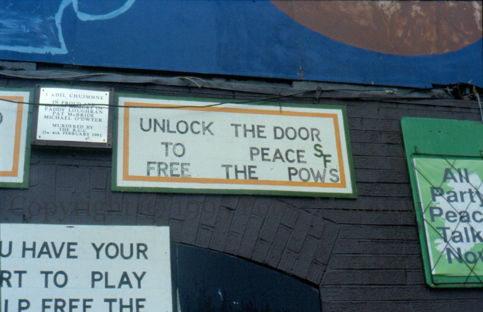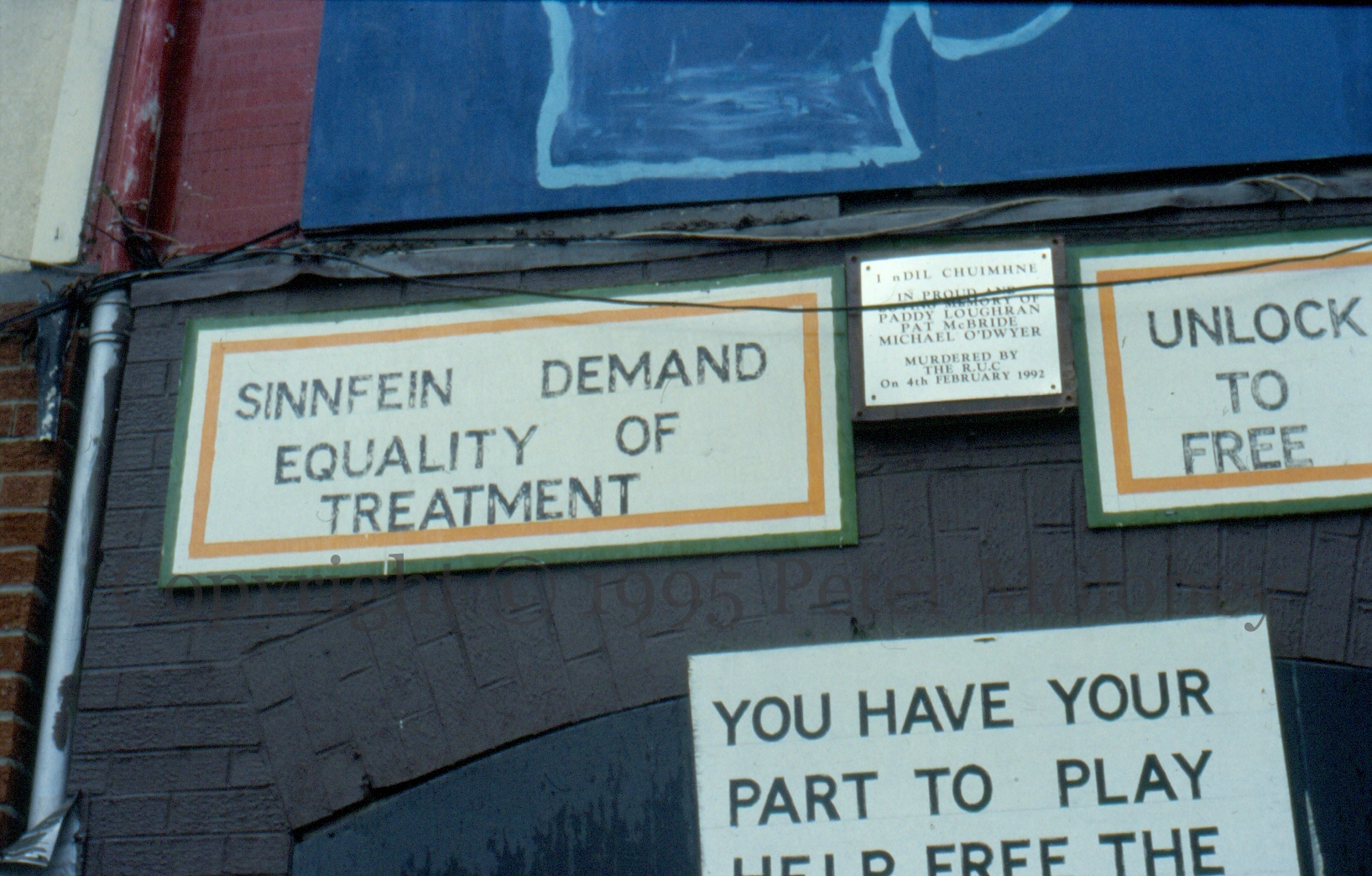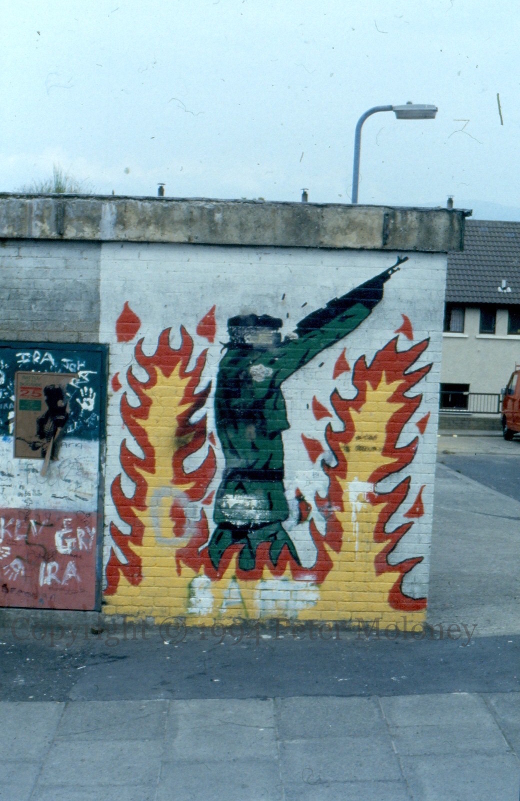 Londoner Stephen Lawrence was murdered by stabbing in 1993 and, although arrests were made, no charges were brought. A 1998 public inquiry found that the Metropolitan Police Service was “institutionally racist”. In 2012, two of the original suspects were found guilty of the murder (WP). Catholic Robert Hamill was beaten to death by loyalists in Portadown in 1997 while police in an RUC land-rover looked on (WP). The second image is of a fist smashing a swastika: “Stand firm – break the bigots [sic] back” on top of a Drumcree stand-off mural (which will become visible again in later years). Artana Street, Belfast