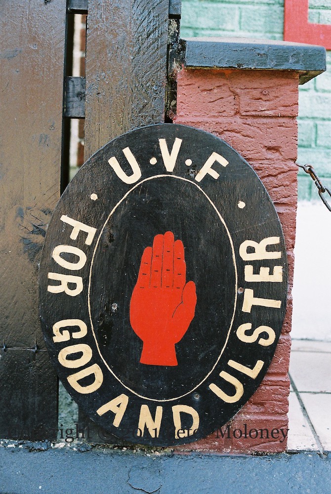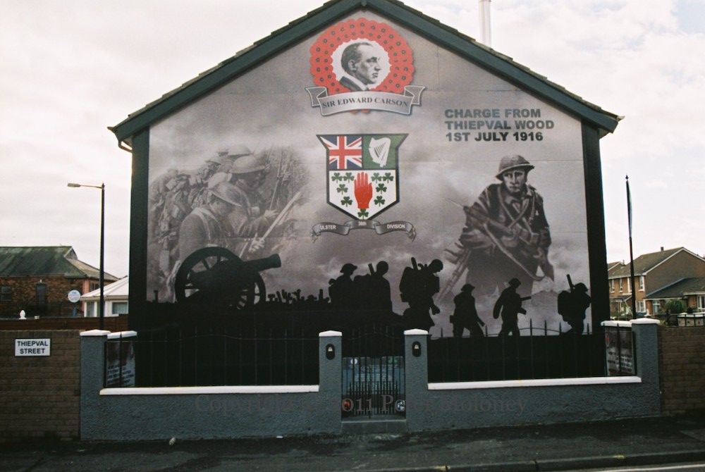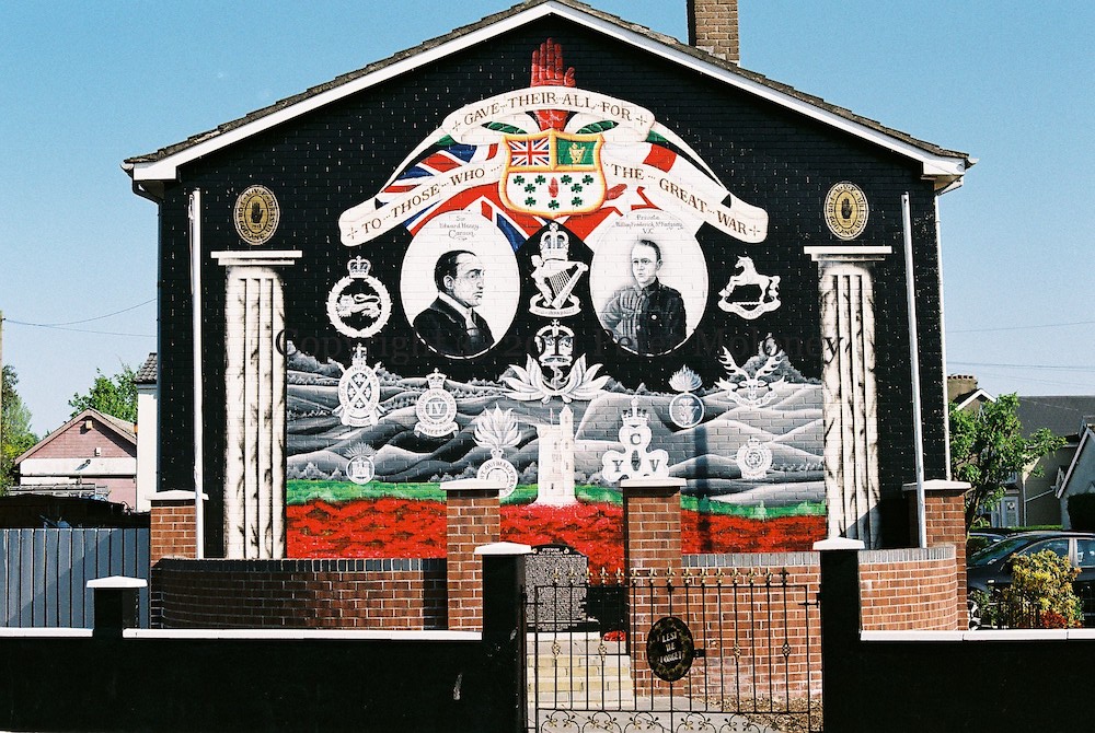 The mural replaces one to the UVF’s Platoon 5 , A Co., and the memorial stone is dedicated to it (and not to the WWI soldiers from the 36th (Ulster) Division who died in the charge from Thiepval Wood, July 1st, 1916): “This stone is dedicated to the memory of the fallen volunteers of No. 5 platoon A company 1st Belfast battalion Ulster Volunteer Force. ‘As poppy petals gently fall/Remember us who gave our all/Not in the mud of foreign lands/Nor buried in the desert sands//In Ulster field and farm and town/Fermanagh’s lanes and Drumlin’d Down/We died that violent death should cease/And Ulstermen might live in peace’ Lest we forget.” For the side walls, see Thiepval St.
