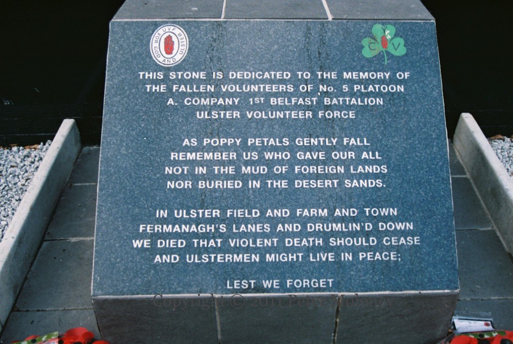 The small plaque in the alcove behind the Eastway club is replaced by a much more substantial stone: “South-East Antrim Brigade. This memorial is dedicated to the memory of the officers and members of our organisation who were murdered by the enemies of Ulster and to those who paid the supreme sacrifice whilst on active service during the present conflict. Quis separabit. ‘They shall not grow old as we that are left grow old/Age shall not weary them nor the years condemn/At the going down of the sun and in the morning/We will remember them’.”