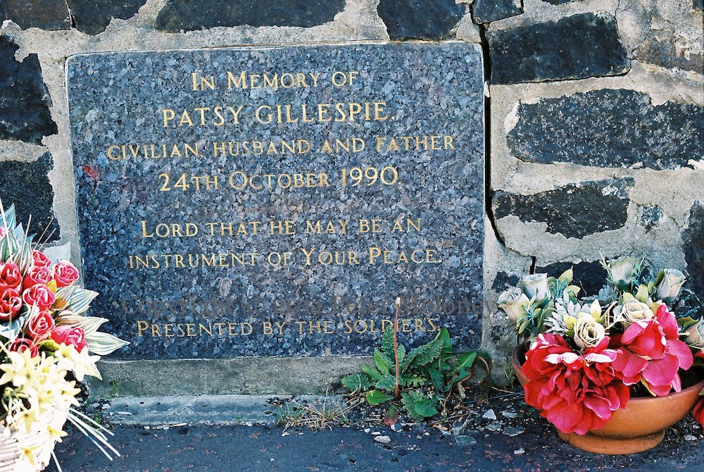 “Civilian, husband and father” Patsy Gillespie worked as a cook at a British Army base in Londonderry. On October 24th, 1990, he was abducted from his Shantallow home and forced to drive a van loaded with 1,000 pounds of explosives to the base at Coshquin, where it killed five British Army soldiers and Patsy himself (WP). The stone “presented by the soldiers” is opposite the bar on the Buncrana Road.