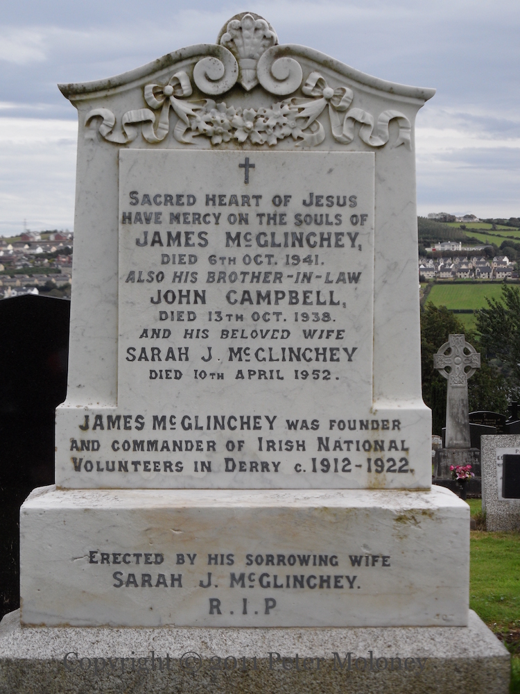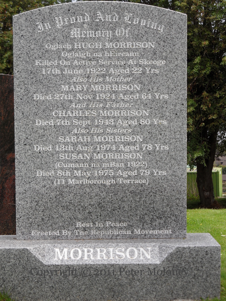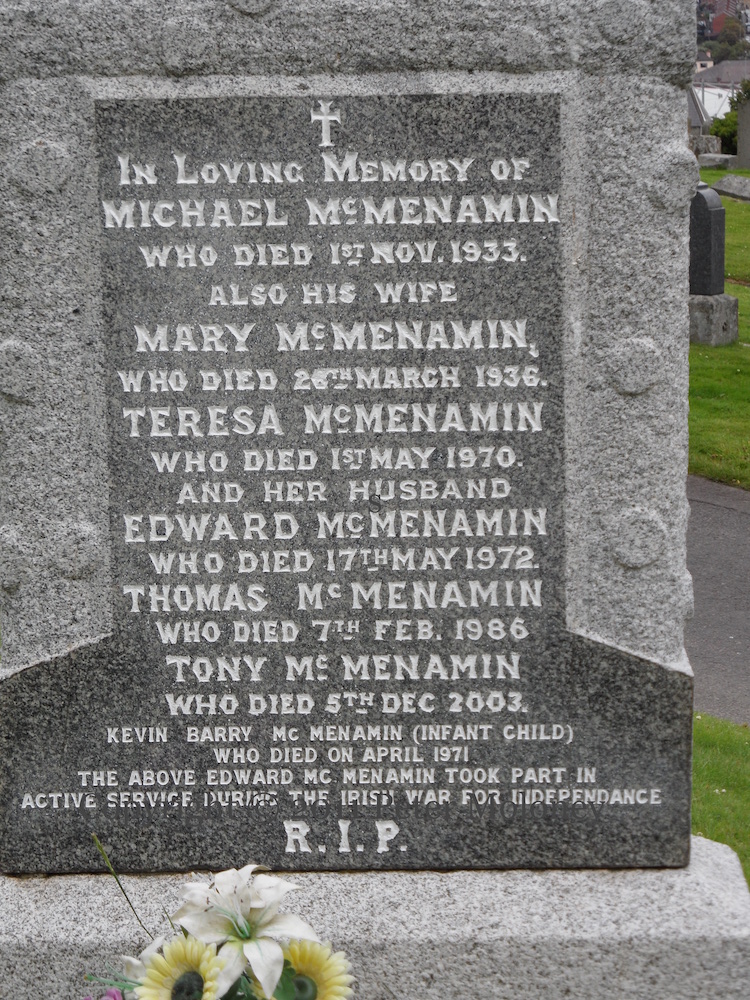 These are four headstones from City Cemetery, Derry, to Irish nationalists who served and/or were killed in the 1920s. In order, they are to “James McGlinchey was founder and commander of Irish National Volunteers in Derry c. 1912-1922”; “Óglach Hugh Morrison, killed on active service at Skeoge 17th June, 1922 [and] Susan Morrison, Cumann na mBan”; “John Gallagher died 21-6-1920 killed in June riots, Derry [and] Hugh Gallagher died 12-12-1922 shot by Free State soldiers at Drumboe Castle”; and, “Edward McMenamin active service during the Irish war for independence.”