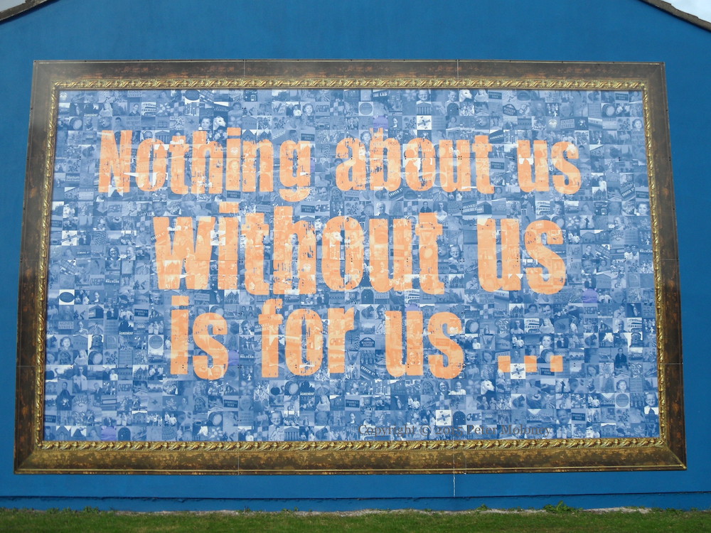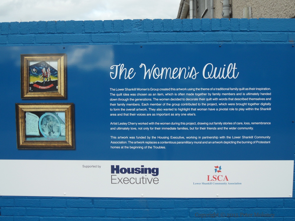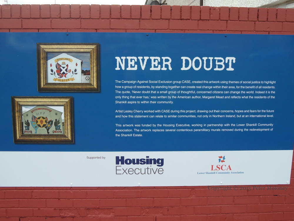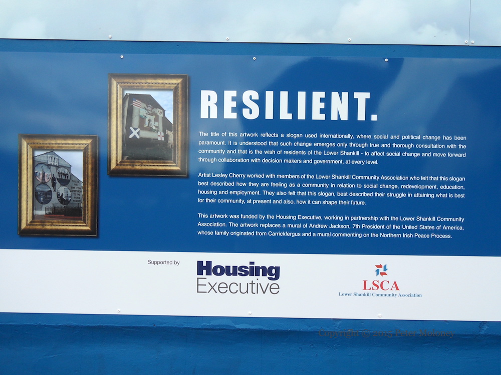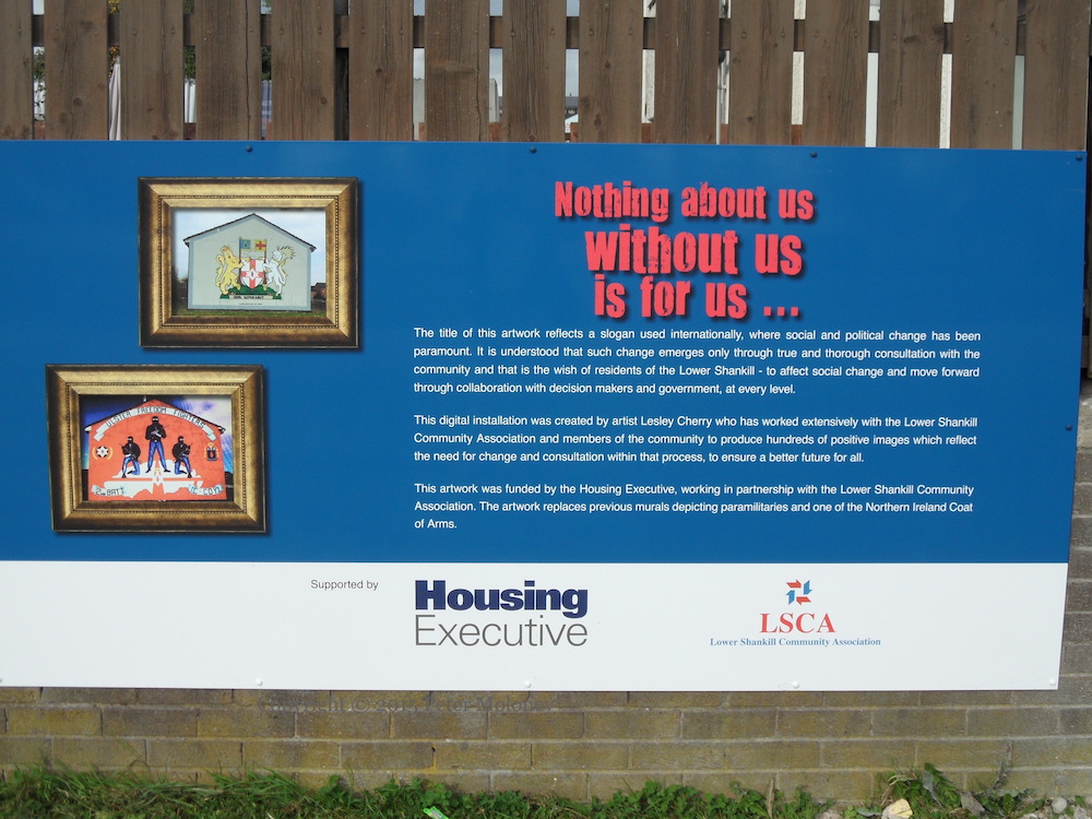 As can be seen from the images of the information boards that accompany them, these pieces are part of a second wave of re-imaging (Visual History 10) in the lower Shankill estate. Compared to the pieces they replace, these are even more neutral in theme, replacing cultural themes with community (and also all printed rather than painted).