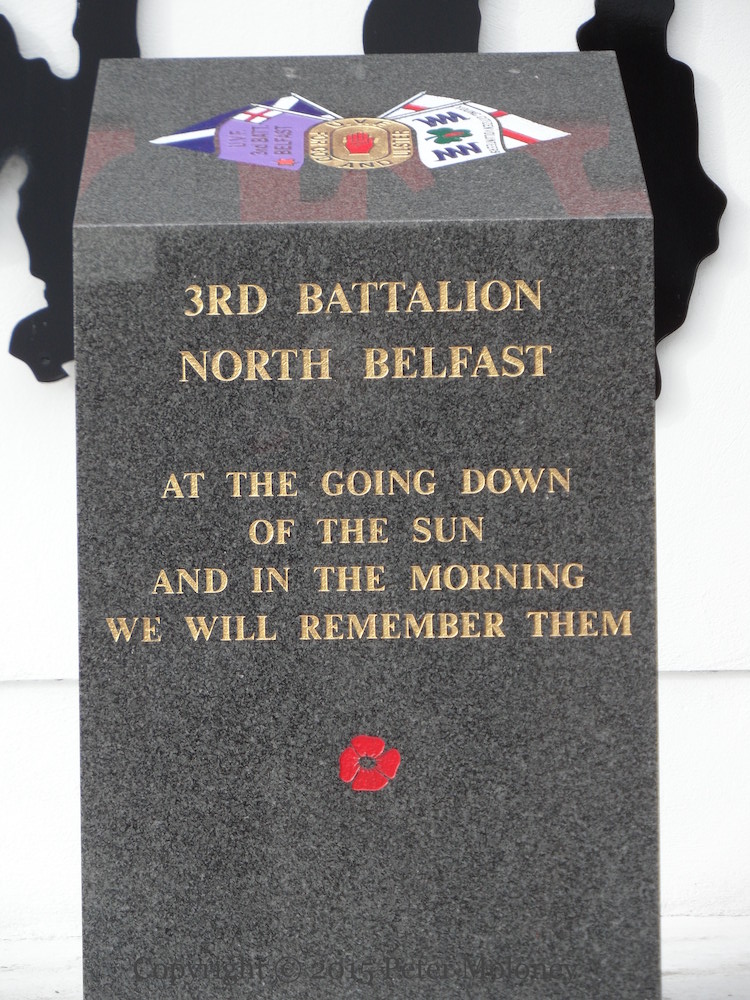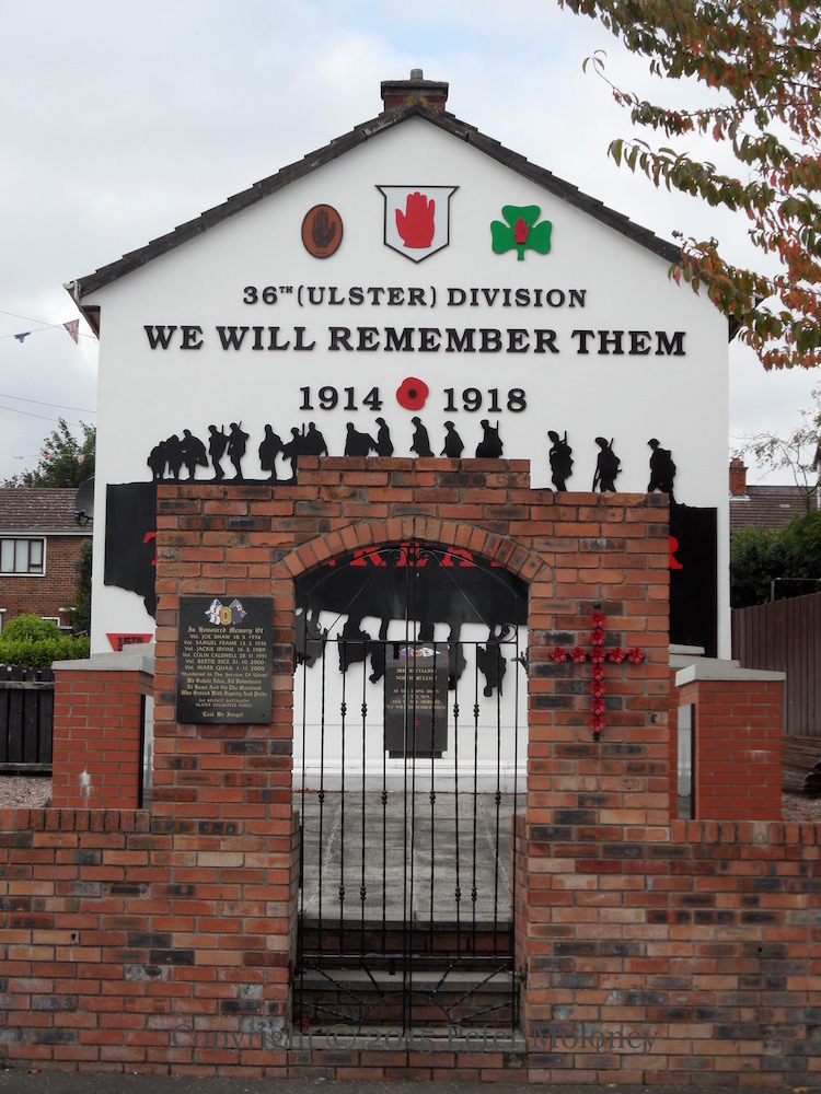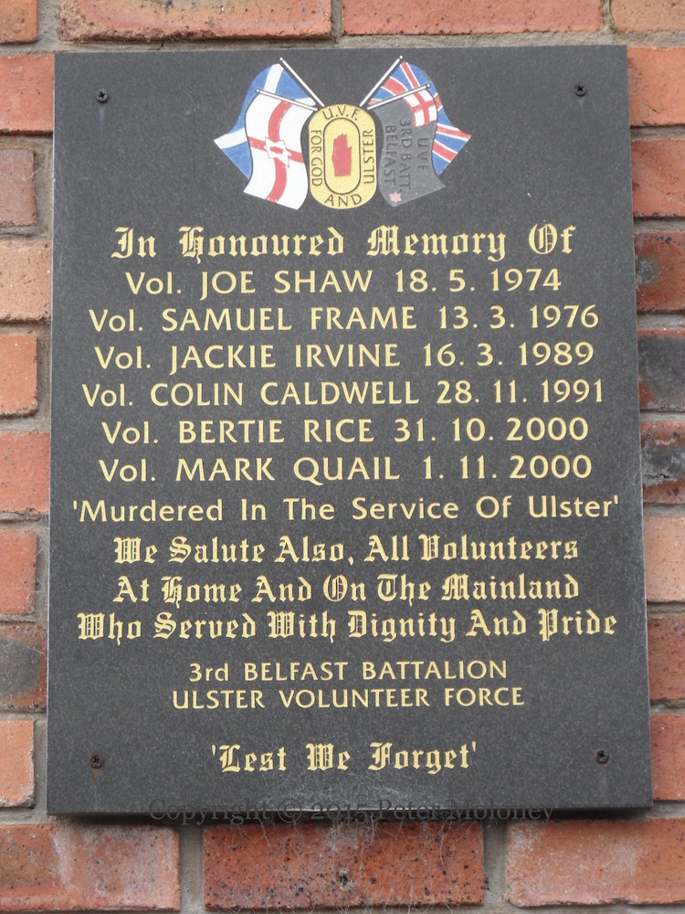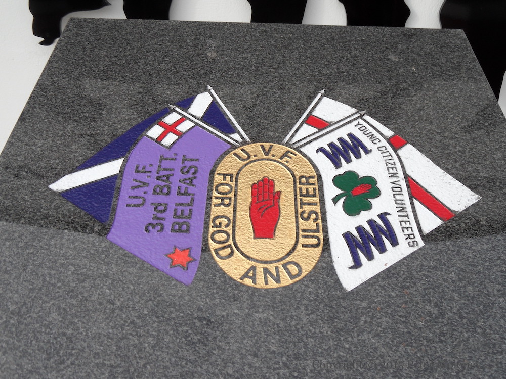 The memorial garden in Mount Vernon, which previously had and Ulster Volunteers mural and UVF stone, has undergone a major redevelopment this year (2015) with a new “cut-out” mural to the 36th (Ulster) Division and stand-alone memorial plaques to six UVF (3rd Belfast Battalion) members who were listed the plaque on the outside wall of the garden. “Murdered in the service of Ulster: Joe Shaw 18-5-1974, Samuel Frame 13-3-1976, Jackie Irvine 16-3-1989. Colin Caldwell 28-11-1991, Bertie Rice 31-10-2000, Mark Quail 1-11-2000.”